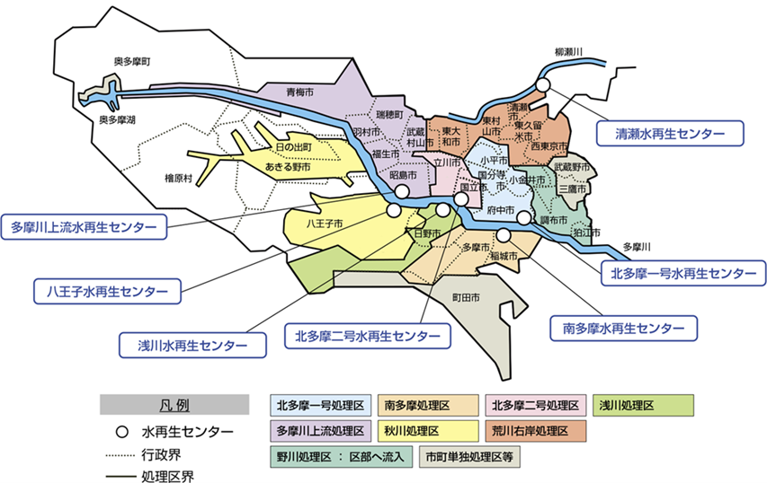 【多摩地域において都が管理する水再生センターの配置と処理区】